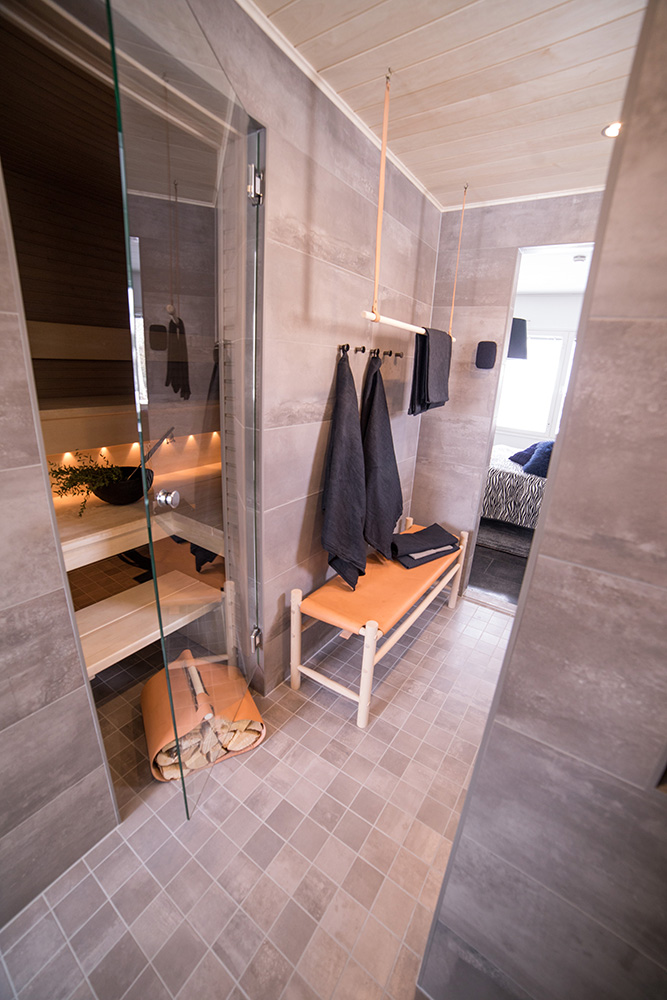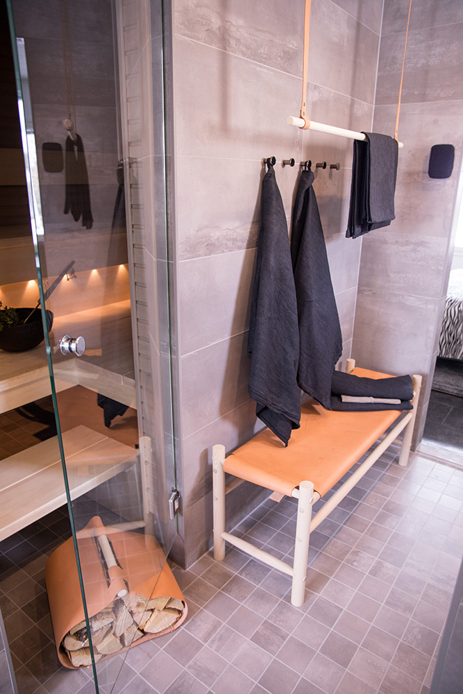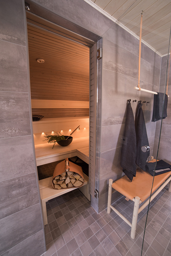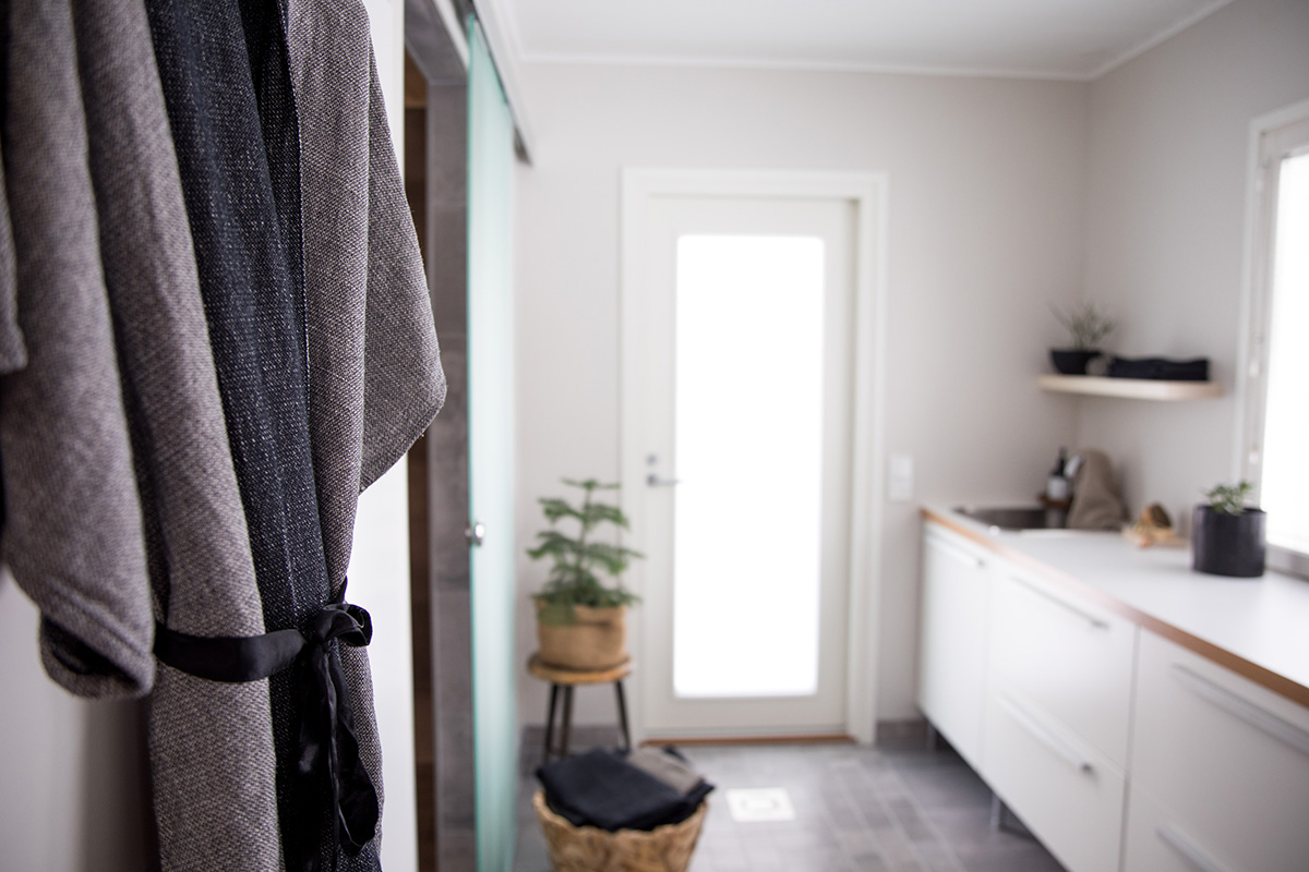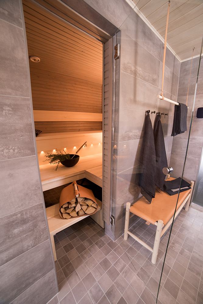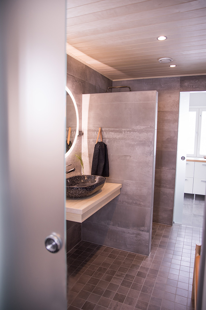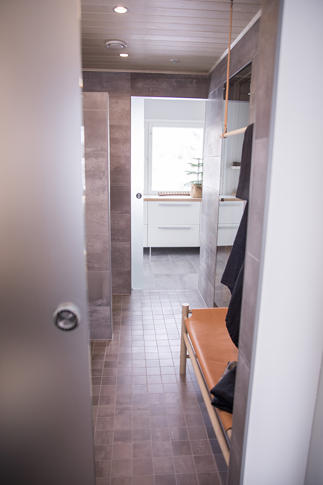 Kohteessa uudistettiin täysin sauna, kylpyhuone ja kodinhoitohuone, ainoastaan saunan paneelit haluttiin säilyttää. Asunnon omistajille on tärkeää että historia ja uusi kulkevat käsi kädessä,  tämä ajatus kulkee myös läpi koko kodin.