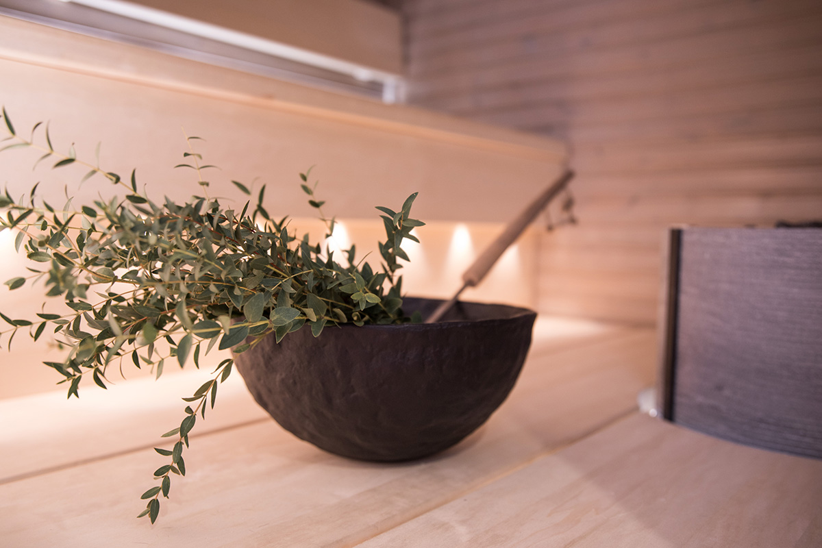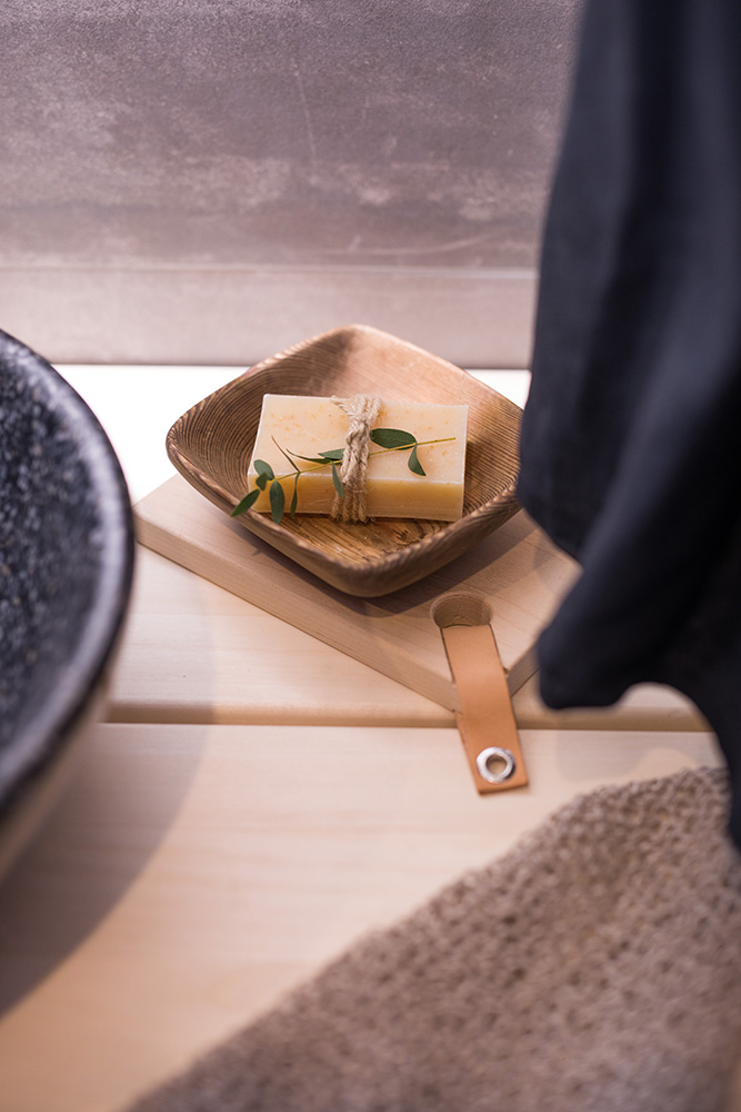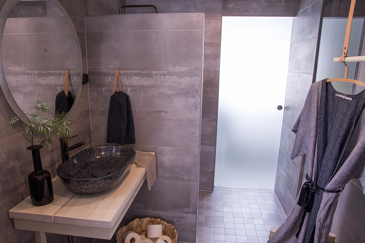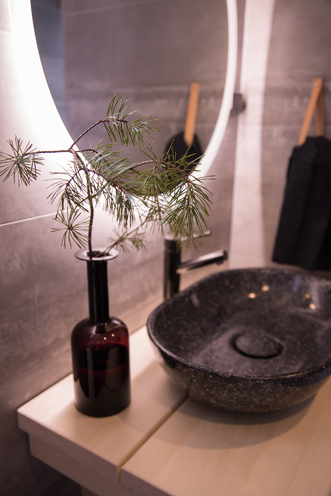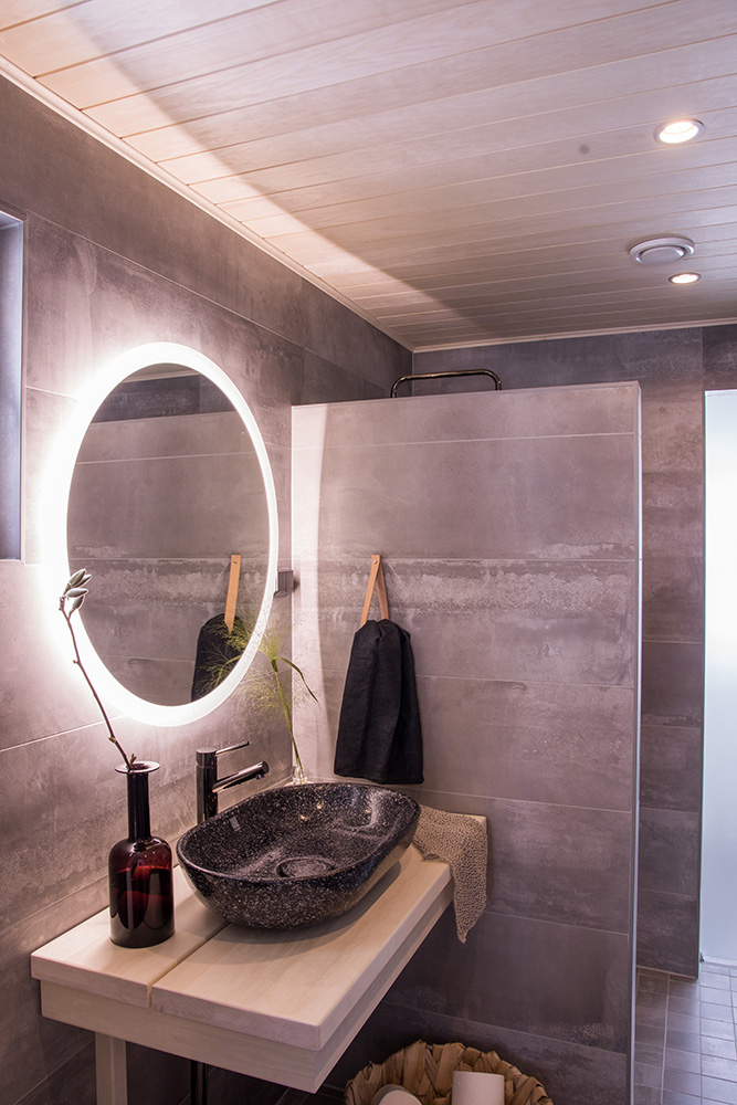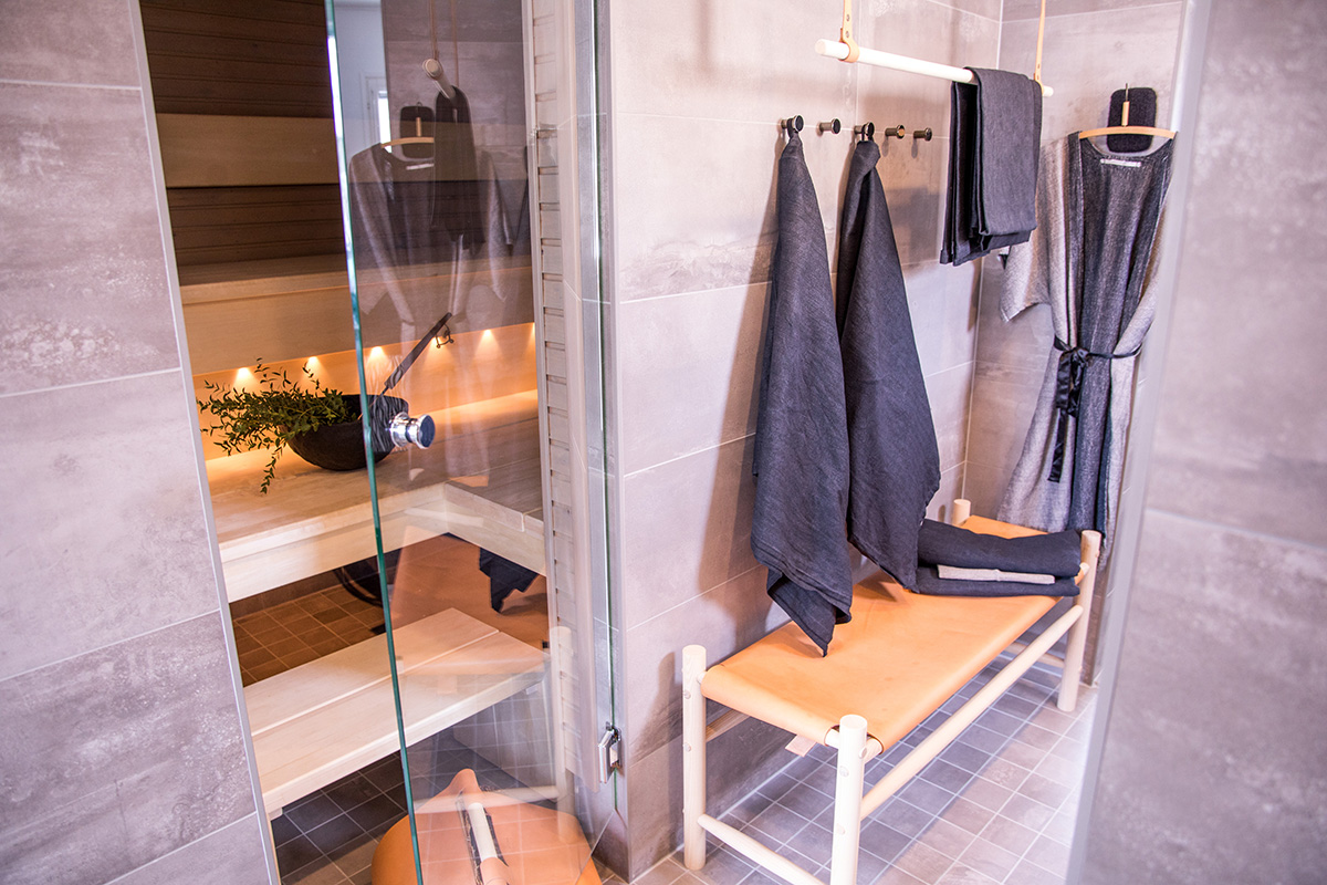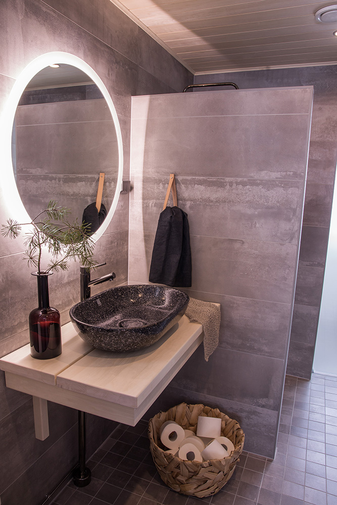 Kohteessa uudistettiin täysin sauna, kylpyhuone ja kodinhoitohuone, ainoastaan saunan paneelit haluttiin säilyttää. Asunnon omistajille on tärkeää että historia ja uusi kulkevat käsi kädessä,  tämä ajatus kulkee myös läpi koko kodin.