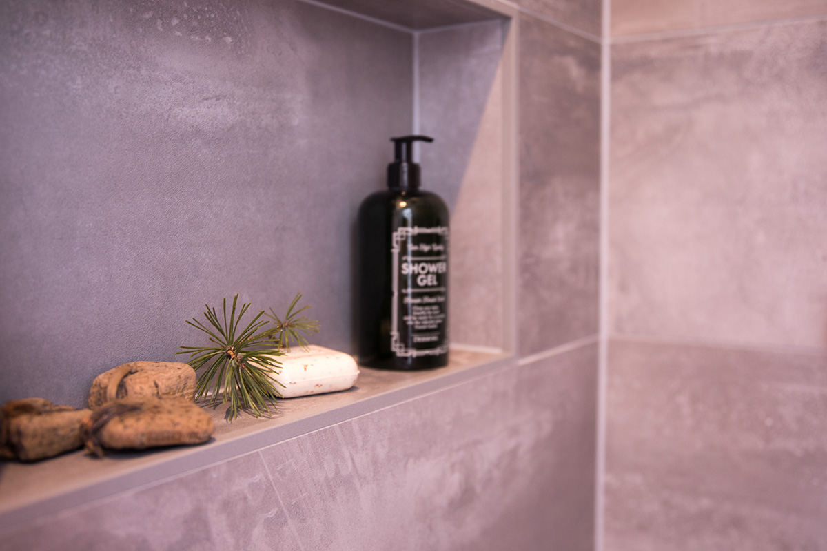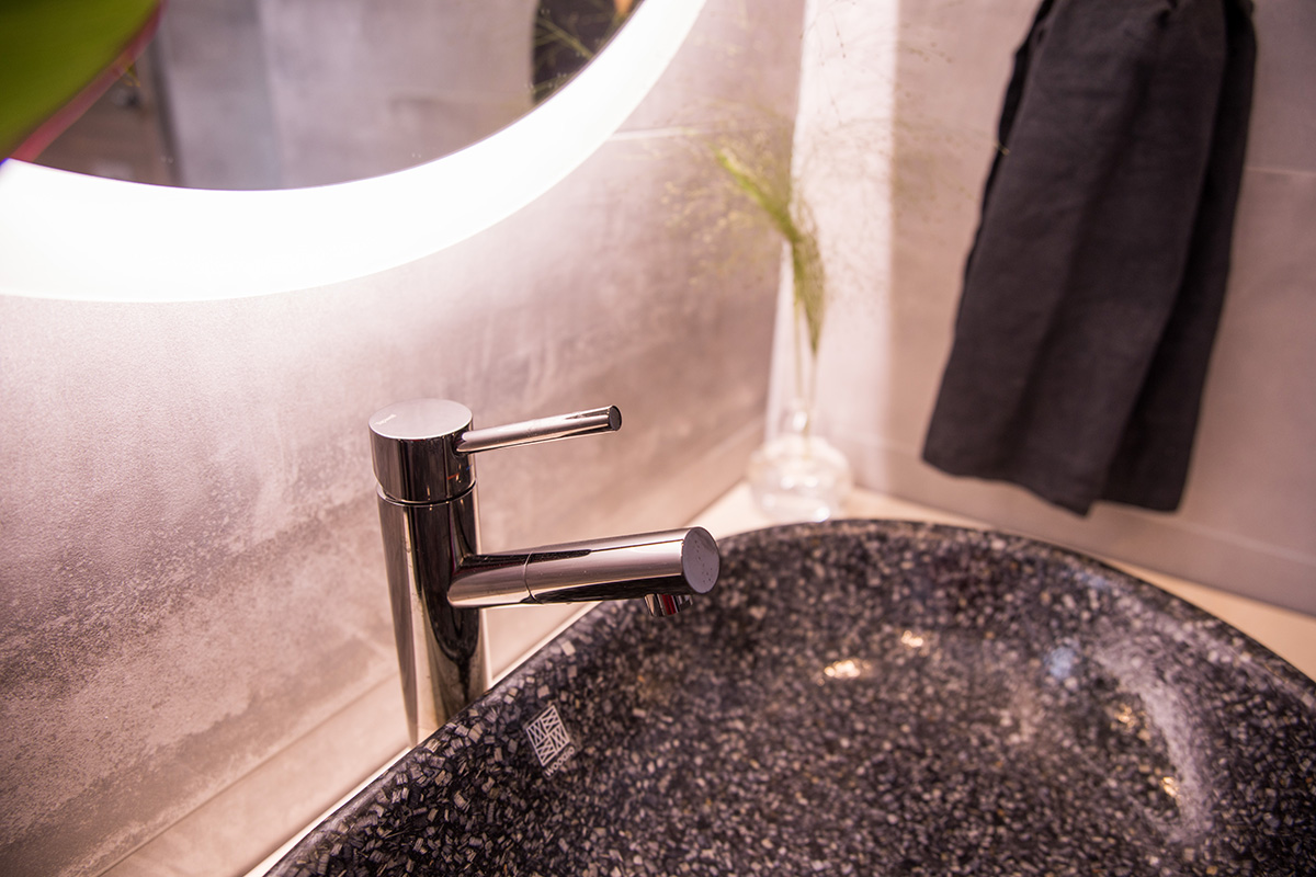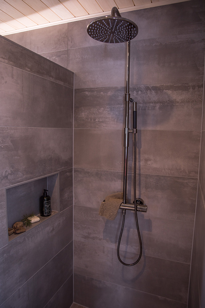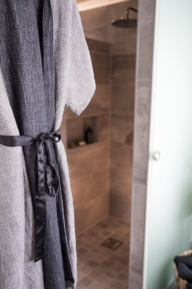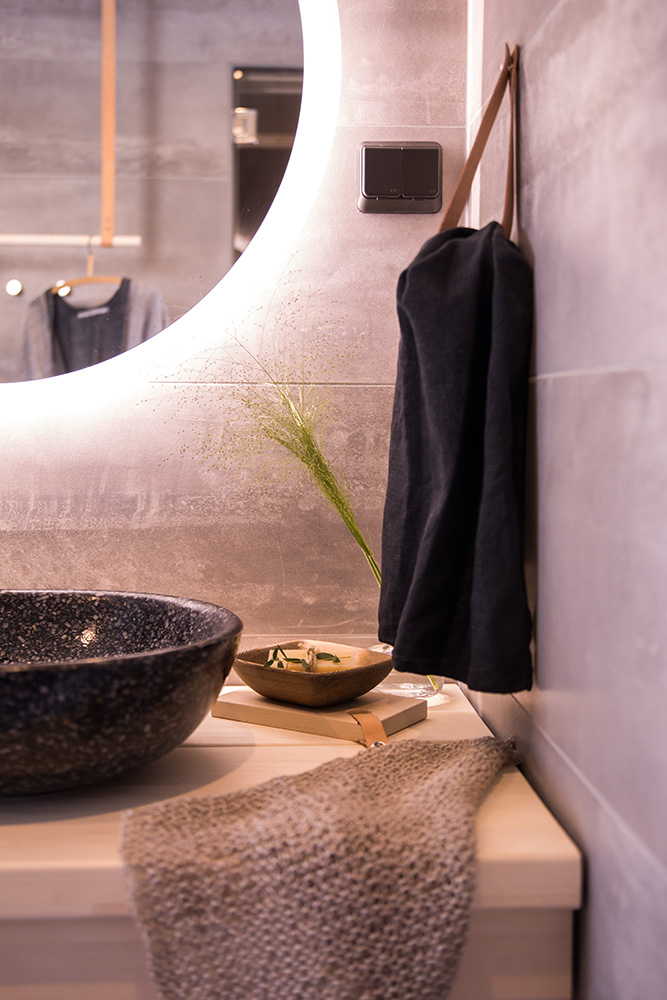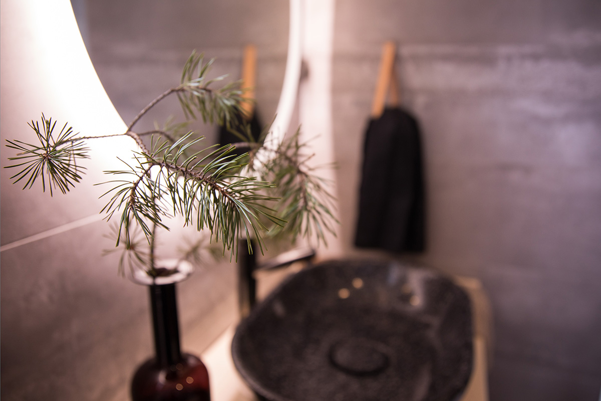 Kohteessa uudistettiin täysin sauna, kylpyhuone ja kodinhoitohuone, ainoastaan saunan paneelit haluttiin säilyttää. Asunnon omistajille on tärkeää että historia ja uusi kulkevat käsi kädessä,  tämä ajatus kulkee myös läpi koko kodin.